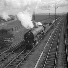 A1 Pacific 60158 "Aberdonian" is framed by trackside structures at Wymondley 3/61 [102158]