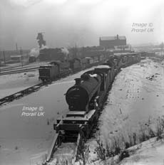 O4 63737 and lines of other 2-8-0s out of use in the snow at Darnall (Sheffield) MPD 1/63 [102362]