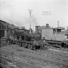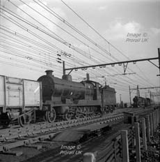 J50 0-6-0T 68979 heads a train of empty stock past King's Cross Yard 5/60 [102519]