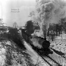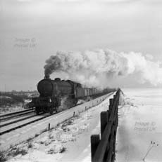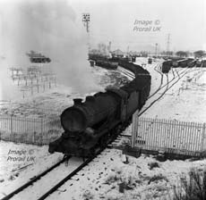 B16 4-6-0 61467 on train of mineral wagons passes drifted snow at Bramwith 1/63 [102270]